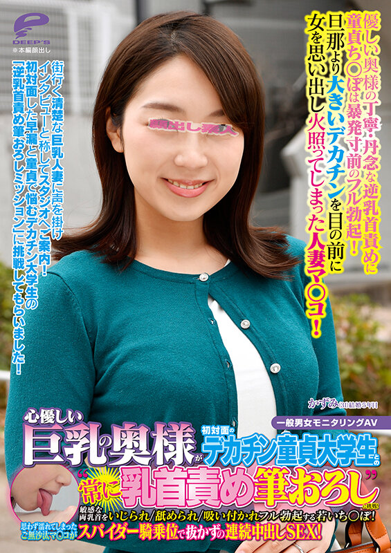 【dkra01001】心優しい巨乳の奥様が初対面のデカチン童貞大学生との‘常に乳首責め筆おろし’に挑戦!敏感な両乳首をいじられ/舐められ/吸い付かれフル勃起する若いち○ぽ!思わず濡れてしまったご無沙汰マ○コがスパイダー騎乗位で抜かずの連続中出しSEX!かずみ / ディープス