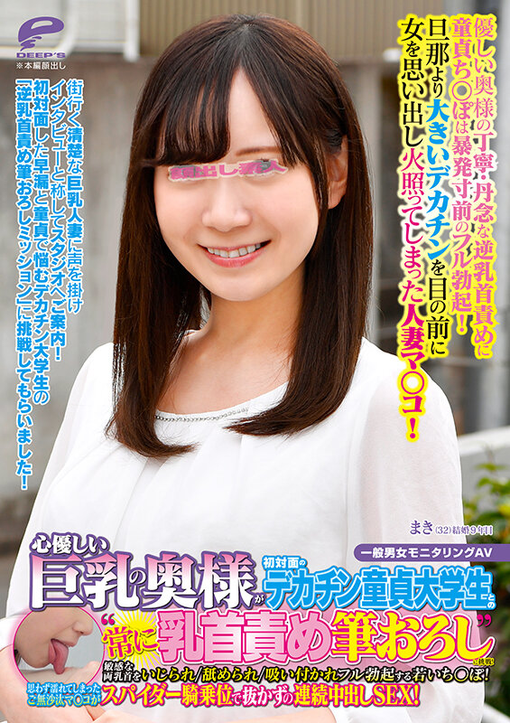 メーカー「ディープス」がおくる最新動画「心優しい巨乳の奥様が初対面のデカチン童貞大学生との‘常に乳首責め筆おろし’に挑戦!敏感な両乳首をいじられ/舐められ/吸い付かれフル勃起する若いち○ぽ!思わず濡れてしまったご無沙汰マ○コがスパイダー騎乗位で抜かずの連続中出しSEX!まき」の無料サンプル動画・あらすじを紹介しています。